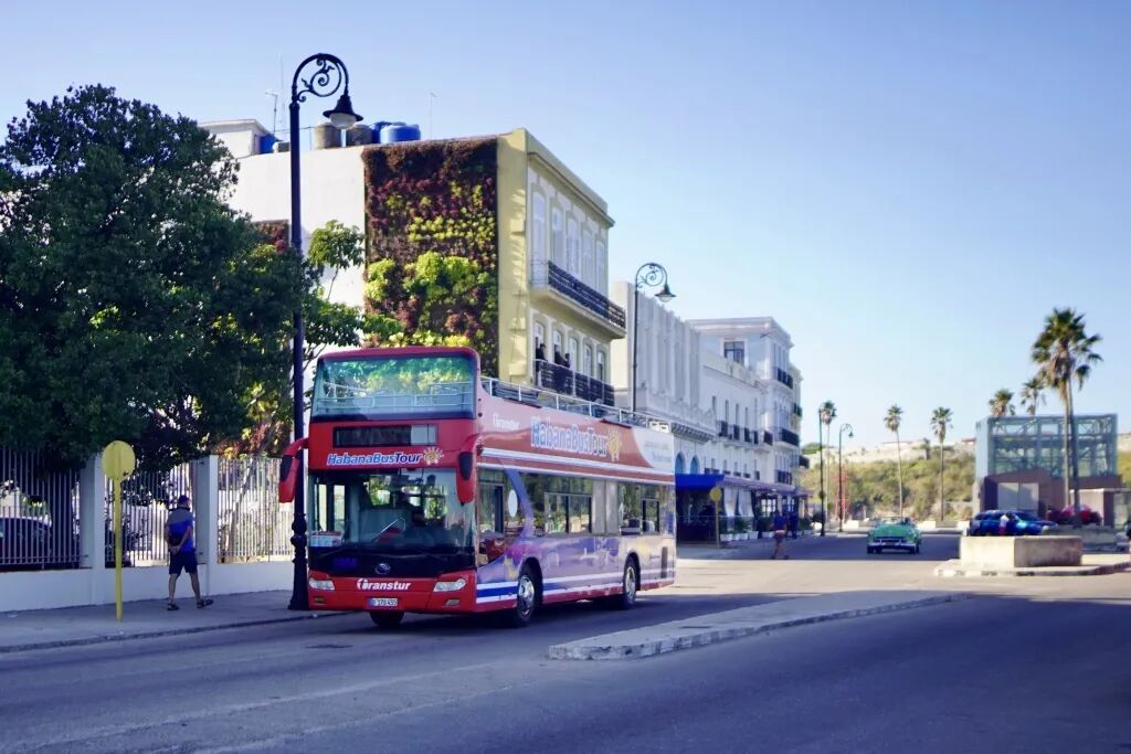 2月13日,在古巴首都哈瓦那,一辆旅游巴士行驶在街道上。新华社 图
